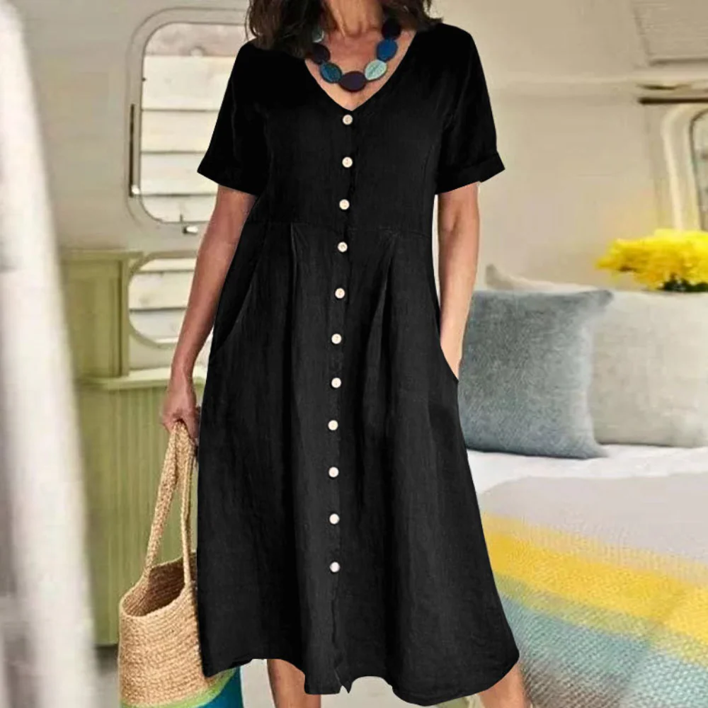 Marta Robe midi ample et stylée pour femmes est un vêtement décontracté mais élégant qui allie confort et style. Avec sa coupe ample et sa combinaison de coton et de lin de haute qualité, elle offre une sensation de confort et un look intemporel, parfaits pour l'été.